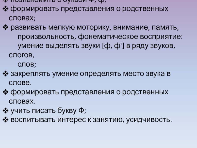 Задачи: познакомить с буквой Ф, ф; формировать представления о родственных словах; развивать мелкую моторику, внимание, память, произвольность, фонематическое восприятие: умение выделять звуки [ф, ф'] в ряду звуков, слогов, слов; закреплять