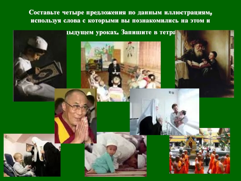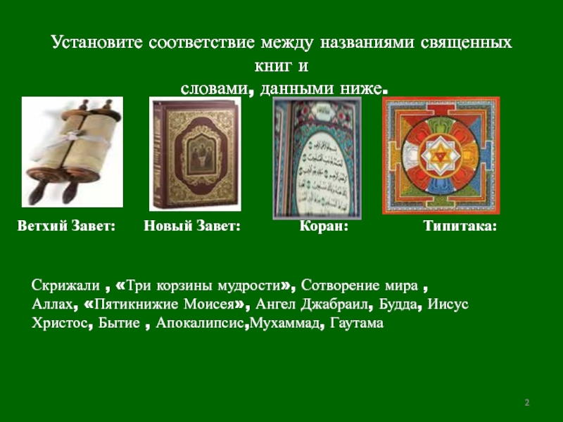 Скрижали , «Три корзины мудрости», Сотворение мира ,Аллах, «Пятикнижие Моисея», Ангел Джабраил, Будда, Иисус Христос, Бытие , Апокалипсис,Мухаммад, Гаутама