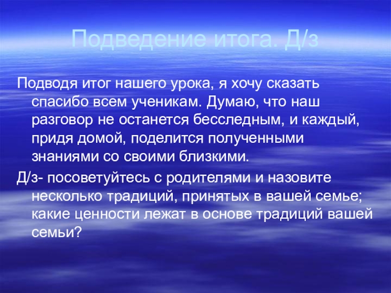 Д/з- посоветуйтесь с родителями и назовите несколько традиций, принятых в вашей семье; какие ценности лежат в основе традиций вашей семьи?