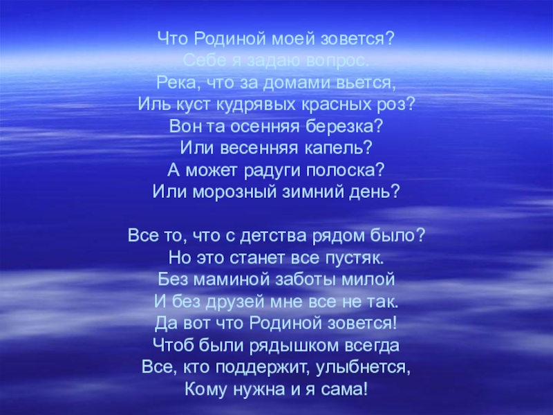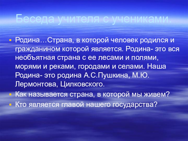 является. Родина- это вся необъятная страна с ее лесами и полями, морями и реками, городами и селами. Наша Родина- это родина А.С.Пушкина, М.Ю.Лермонтова, Цилковского.