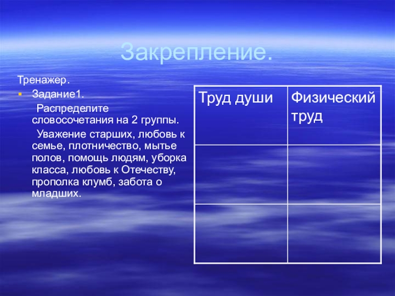 полов, помощь людям, уборка класса, любовь к Отечеству, прополка клумб, забота о младших.