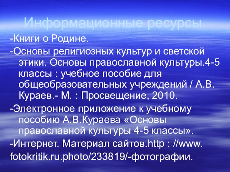 культуры.4-5 классы : учебное пособие для общеобразовательных учреждений / А.В.Кураев.- М. : Просвещение, 2010.