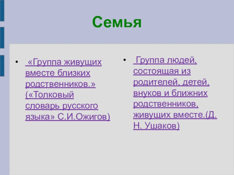 Группа людей, состоящая из родителей, детей, внуков и ближних родственников, живущих вместе.(Д.Н. Ушаков)