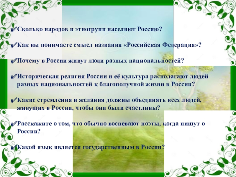 Сколько народов и этногрупп населяют Россию?Как вы понимаете смысл названия «Российская Федерация»?Почему в России живут люди разных