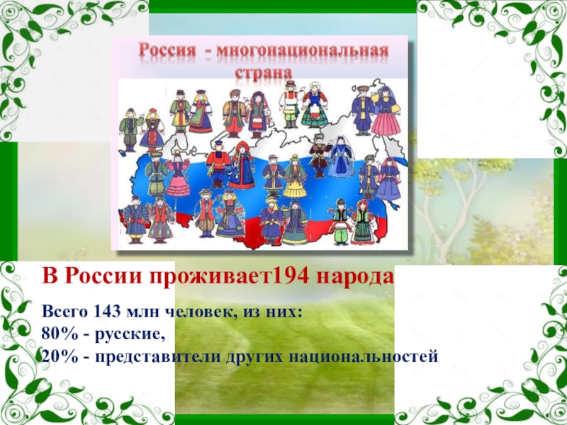 В России проживает194 народаВсего 143 млн человек, из них: 80% - русские, 20% - представители других национальностей