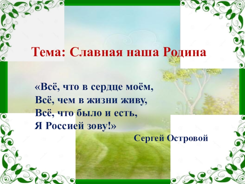 Тема: Славная наша Родина«Всё, что в сердце моём,Всё, чем в жизни живу,Всё, что было и есть,Я Россией зову!»Сергей Островой