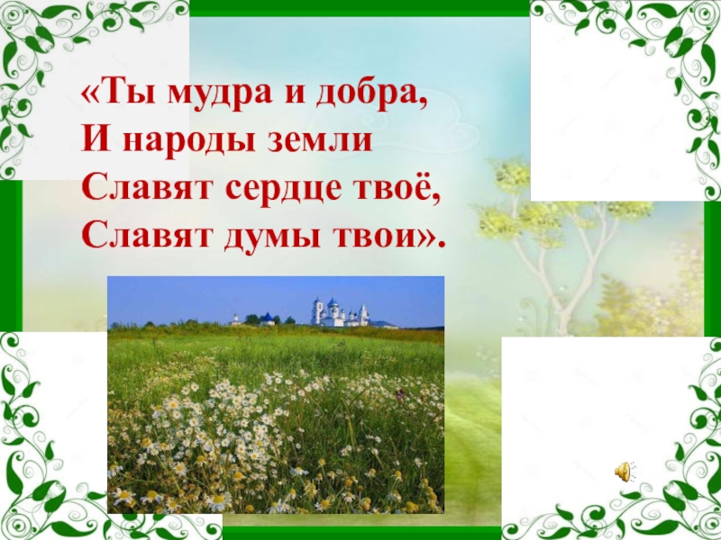 «Ты мудра и добра,И народы землиСлавят сердце твоё,Славят думы твои».