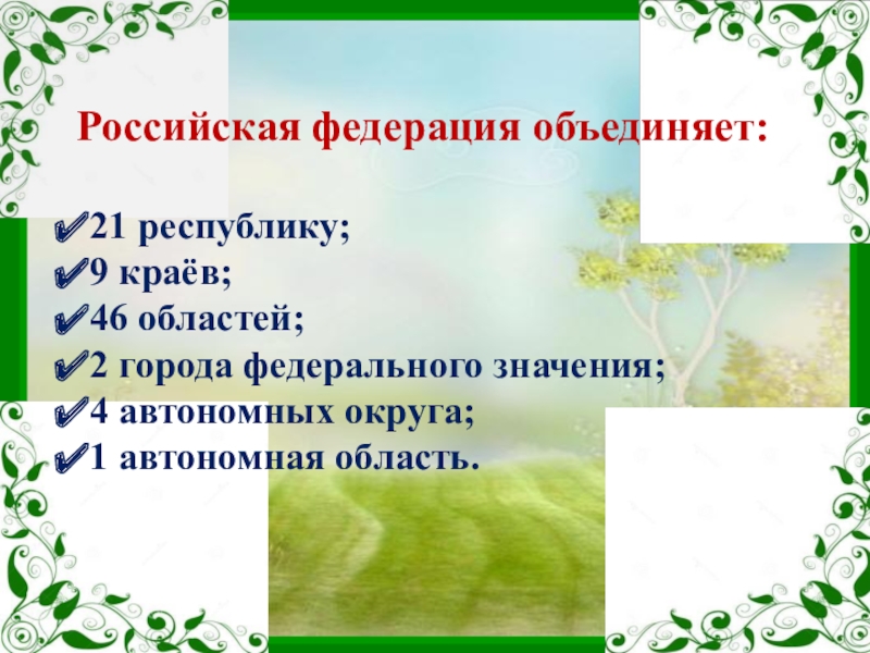Российская федерация объединяет:21 республику;9 краёв;46 областей;2 города федерального значения;4 автономных округа;1 автономная область.