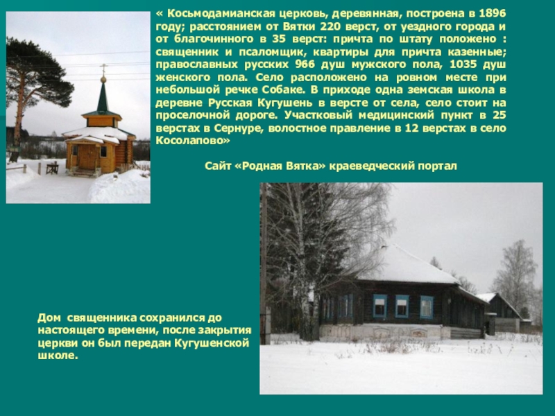 Дом священника сохранился до настоящего времени, после закрытия церкви он был передан Кугушенской школе.