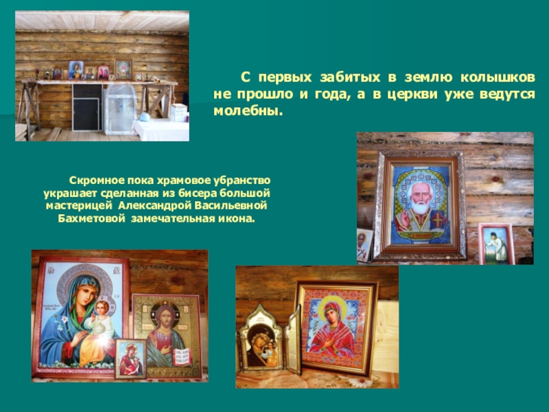 Скромное пока храмовое убранство украшает сделанная из бисера большой мастерицей Александрой Васильевной Бахметовой замечательная икона.