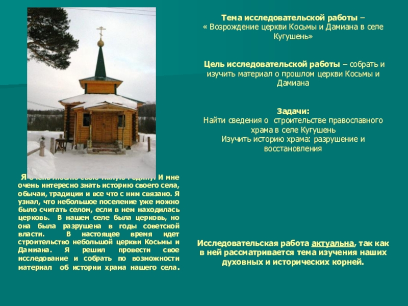 Исследовательская работа актуальна, так как в ней рассматривается тема изучения наших духовных и исторических корней.