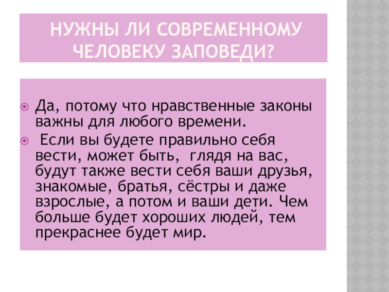Если вы будете правильно себя вести, может быть, глядя на вас, будут также вести себя ваши друзья, знакомые, братья, сёстры и даже взрослые, а потом и ваши дети. Чем больше будет хороших людей, тем прекраснее будет мир.