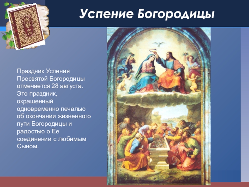 одновременно печалью об окончании жизненного пути Богородицы и радостью о Ее соединении с любимым Сыном.