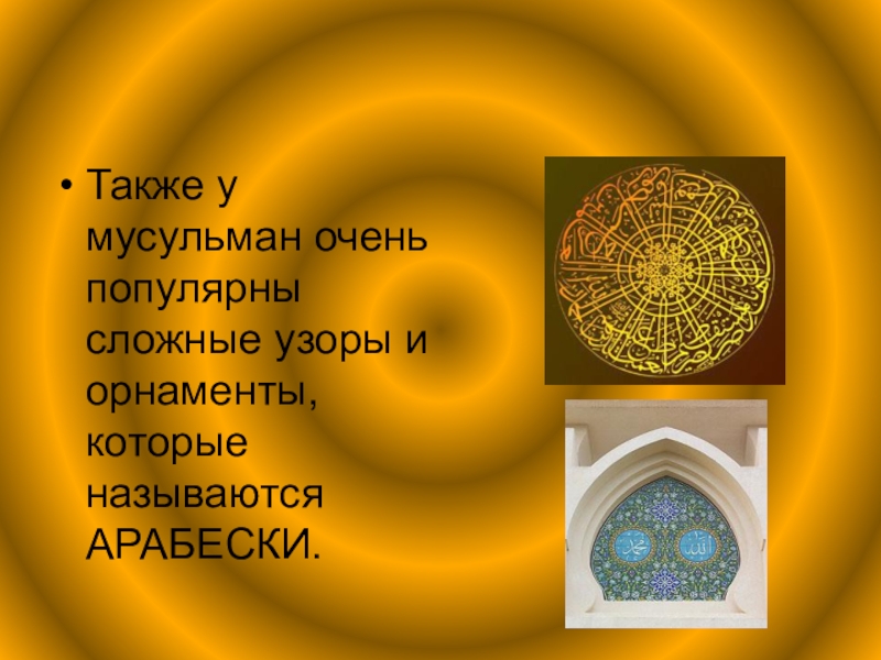 Слайд 21Также у мусульман очень популярны сложные узоры и орнаменты, которые называются