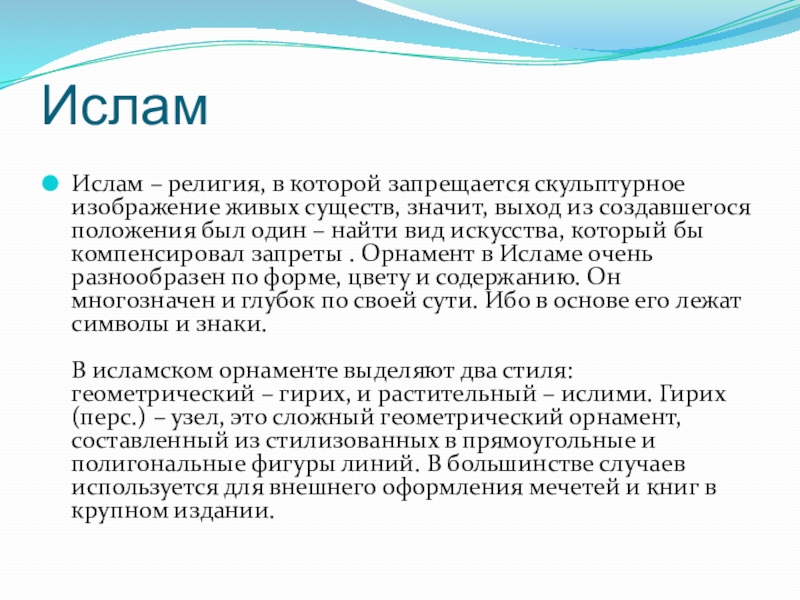 выход из создавшегося положения был один – найти вид искусства, который бы компенсировал запреты . Орнамент в Исламе очень разнообразен по форме, цвету и содержанию. Он многозначен и глубок по своей сути. Ибо в основе его лежат символы и знаки.