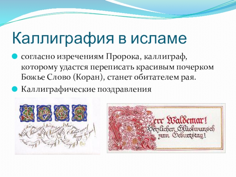 мусульман получило искусство КАЛЛИГРАФИИ.