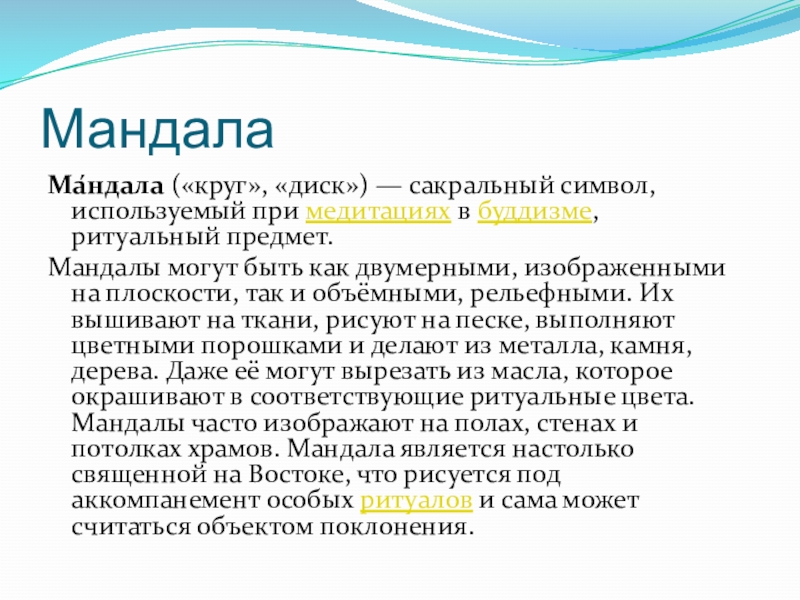 Ма́ндала («круг», «диск») — сакральный символ, используемый при медитациях в буддизме, ритуальный предмет.