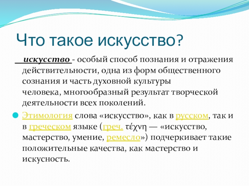 отражения действительности, одна из форм общественного сознания и часть духовной культуры человека, многообразный результат творческой деятельности всех поколений.