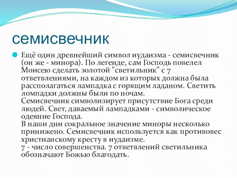7 - число совершенства. 7 ответвлений светильника обозначают Божью благодать.