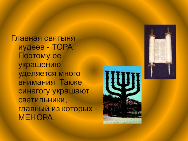 Главная святыня иудеев - ________. Поэтому ее украшению уделяется много внимания. Также синагогу украшают светильники, главный из которых - ___________.