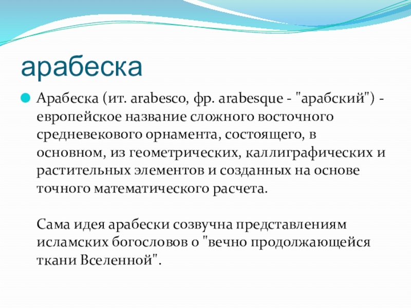 Сама идея арабески созвучна представлениям исламских богословов о "вечно продолжающейся ткани Вселенной".