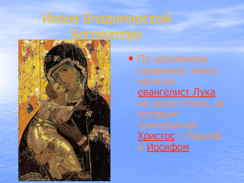 По церковному преданию, икону написал евангелист Лука на доске стола, за которым трапезничал Христос с Марией и Иосифом
