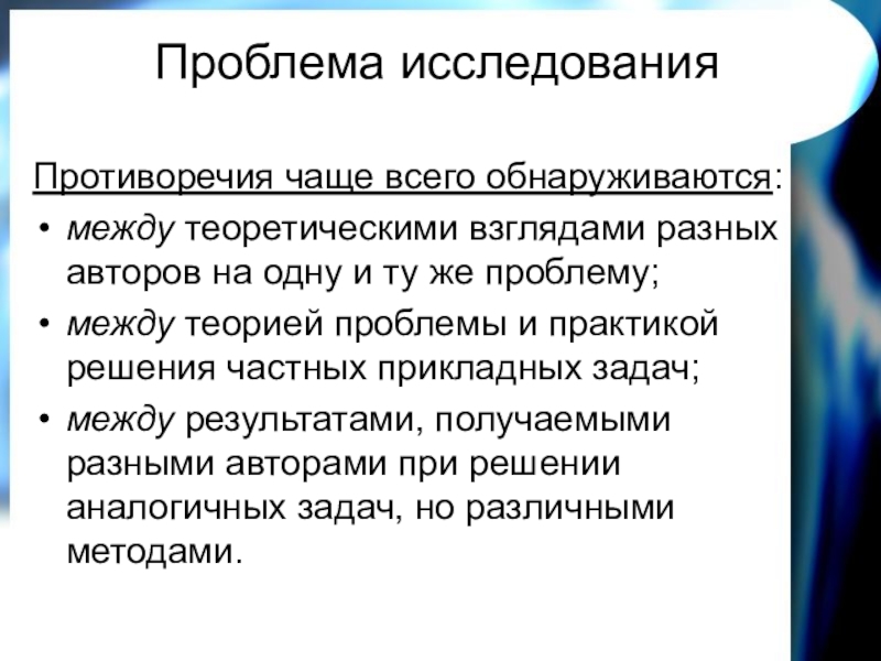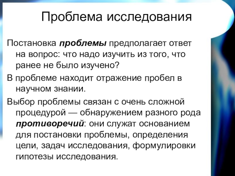 Выбор проблемы связан с очень сложной процедурой — обнаружением разного рода противоречий: они служат основанием для постановки проблемы, определения цели, задач исследования, формулировки гипотезы исследования.