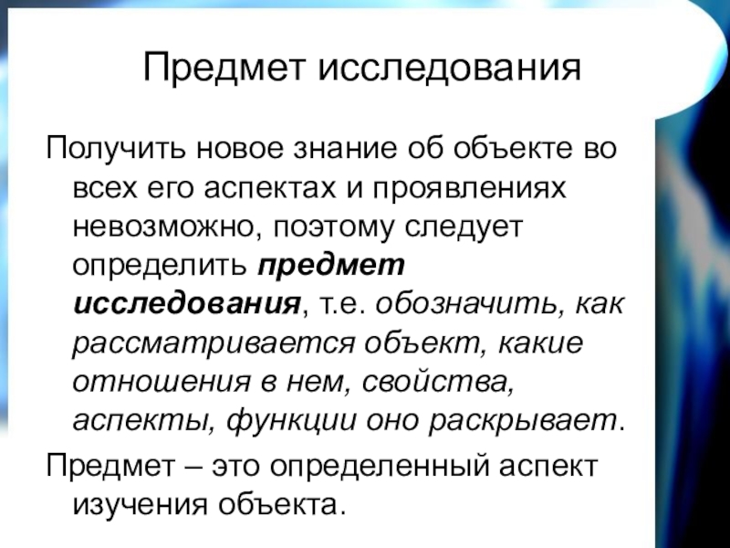 проявлениях невозможно, поэтому следует определить предмет исследования, т.е. обозначить, как рассматривается объект, какие отношения в нем, свойства, аспекты, функции оно раскрывает.
