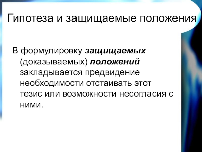 В формулировку защищаемых (доказываемых) положений закладывается предвидение необходимости