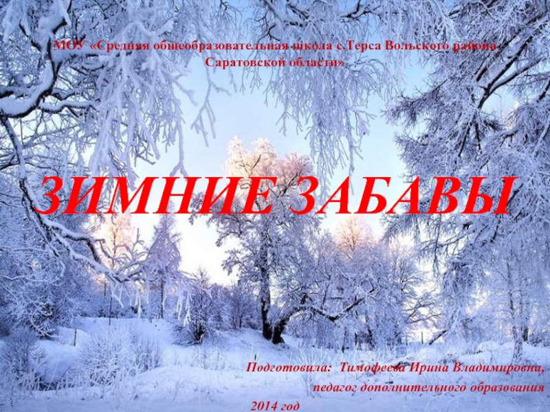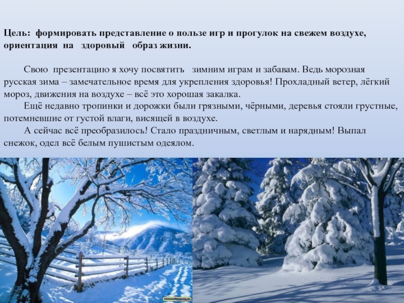 Свою презентацию я хочу посвятить зимним играм и забавам. Ведь морозная русская зима – замечательное время для укрепления здоровья! Прохладный ветер, лёгкий мороз, движения на воздухе – всё это хорошая закалка.
