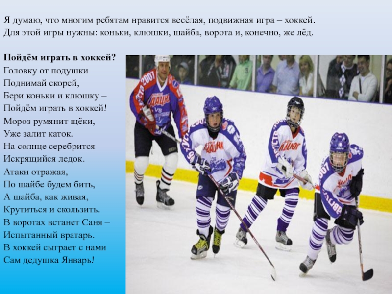 Я думаю, что многим ребятам нравится весёлая, подвижная игра – хоккей.