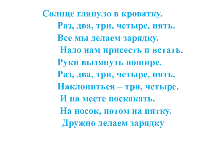 Солнце глянуло в кроватку. Раз, два, три, четыре, пять. Все мы делаем зарядку.