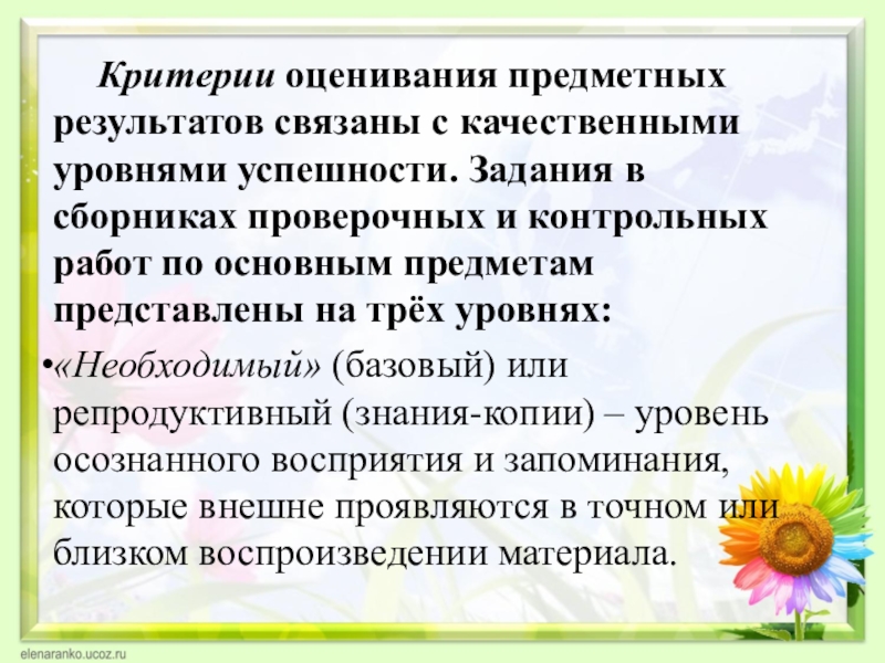 «Необходимый» (базовый) или репродуктивный (знания-копии) – уровень осознанного восприятия и запоминания, которые внешне проявляются в точном или близком воспроизведении материала.