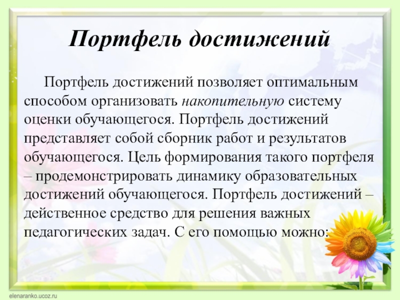 Портфель достижений представляет собой сборник работ и результатов обучающегося. Цель формирования такого портфеля – продемонстрировать динамику образовательных достижений обучающегося. Портфель достижений – действенное средство для решения важных педагогических задач. С его помощью можно: