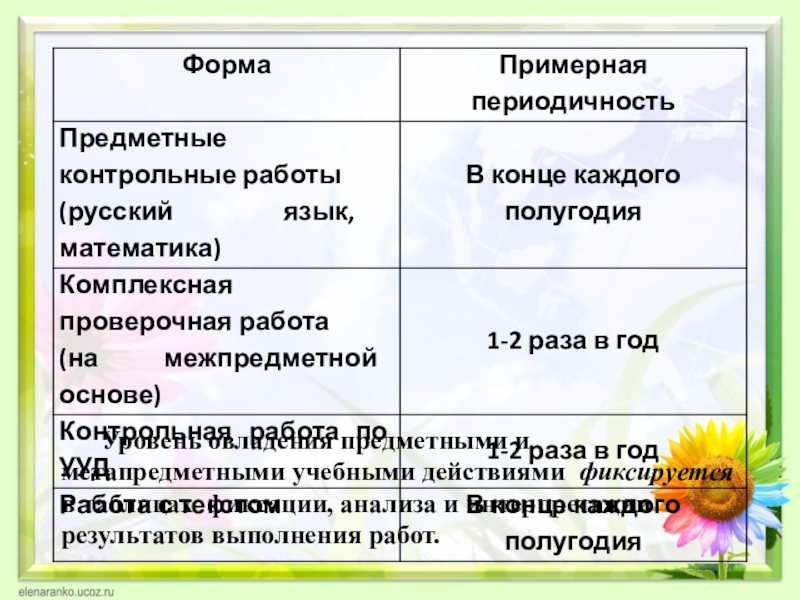 На промежуточное оценивание выносятся предметные и метапредметные результаты. Контроль за предметными результатами и уровнем сформированности метапредметных УУД осуществляется в следующей форме и со следующей периодичностью: