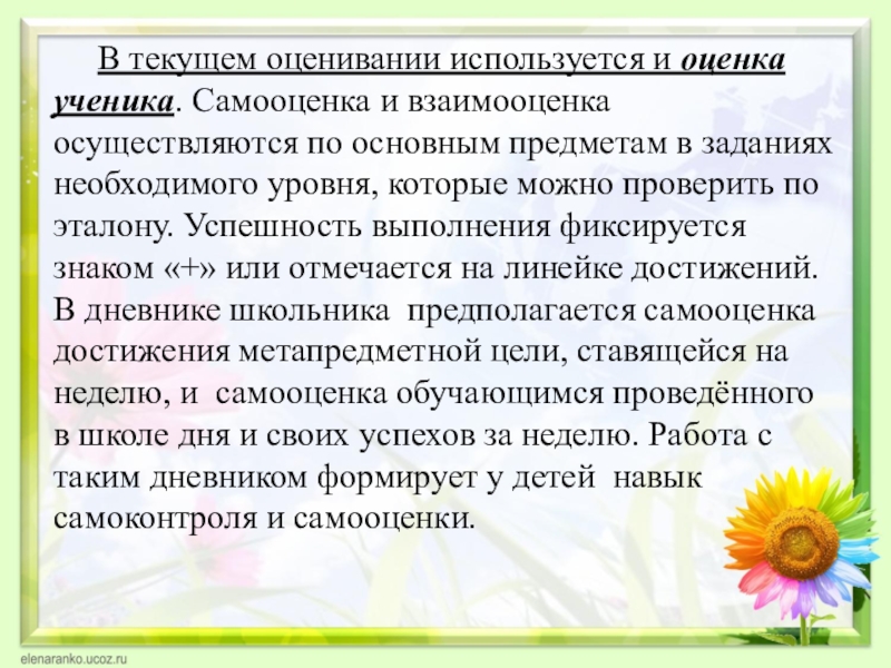 Слайд 27 В текущем оценивании используется и оценка ученика. Самооценка и взаимооценка осуществляются