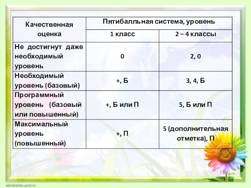 В 1 классе успешность освоения предметных результатов фиксируется знаками «+» и «-», со 2 класса выставляется отметка по 5-балльной шкале.