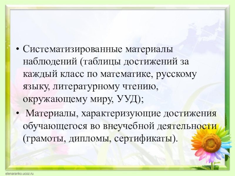 Слайд 36Систематизированные материалы наблюдений (таблицы достижений за каждый класс по математике, русскому
