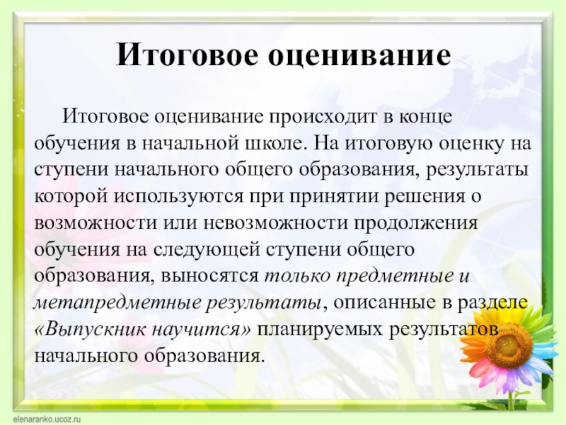 Итоговое оценивание происходит в конце обучения в начальной школе. На