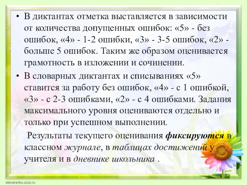 Слайд 25В диктантах отметка выставляется в зависимости от количества допущенных ошибок: «5»