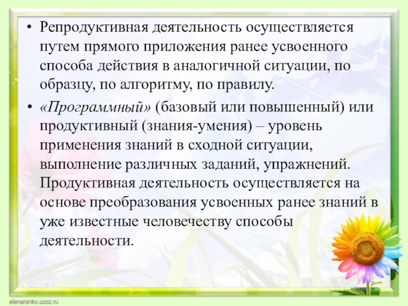 «Программный» (базовый или повышенный) или продуктивный (знания-умения) – уровень применения знаний в сходной ситуации, выполнение различных заданий, упражнений. Продуктивная деятельность осуществляется на основе преобразования усвоенных ранее знаний в уже известные человечеству способы деятельности.