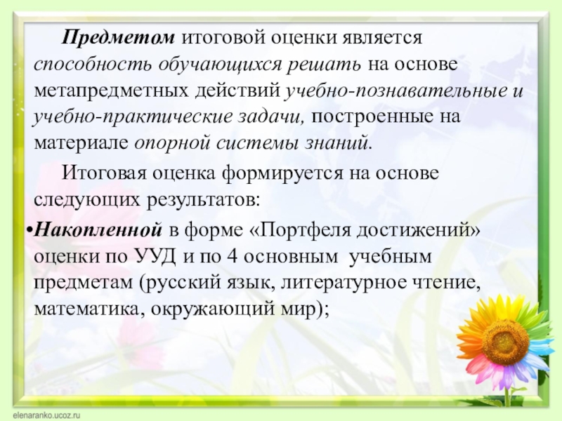 Слайд 10Основным объектом итоговой оценки подготовки выпускников на ступени начального общего образования