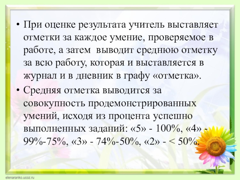 Слайд 24При оценке результата учитель выставляет отметки за каждое умение, проверяемое в