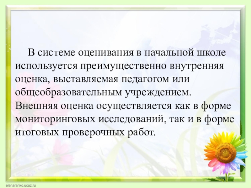 В системе оценивания в начальной школе используется преимущественно внутренняя оценка, выставляемая
