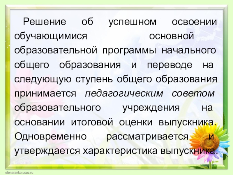 и переводе на следующую ступень общего образования принимается педагогическим советом образовательного учреждения на основании итоговой оценки выпускника. Одновременно рассматривается и утверждается характеристика выпускника.