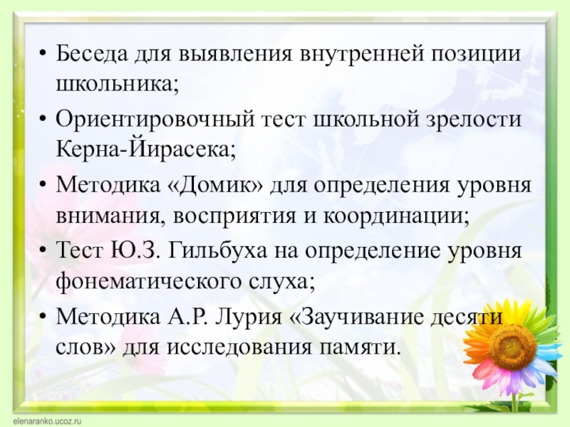 Слайд 16Беседа для выявления внутренней позиции школьника;