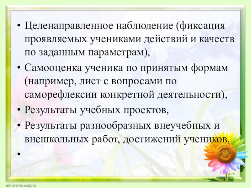 Слайд 7Целенаправленное наблюдение (фиксация проявляемых учениками действий и качеств по заданным параметрам),