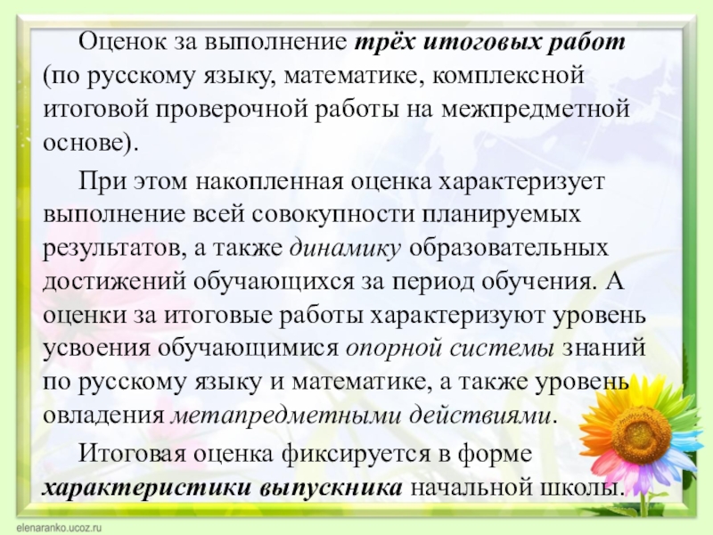При этом накопленная оценка характеризует выполнение всей совокупности планируемых результатов, а также динамику образовательных достижений обучающихся за период обучения. А оценки за итоговые работы характеризуют уровень усвоения обучающимися опорной системы знаний по русскому языку и математике, а также уровень овладения метапредметными действиями.