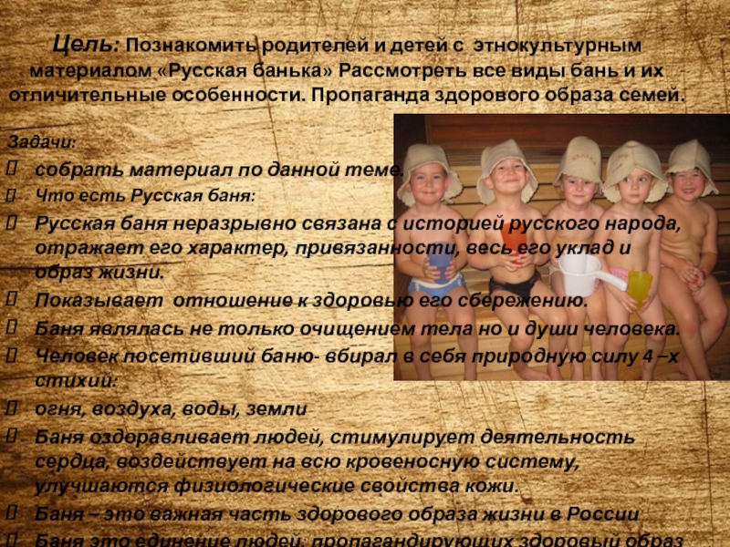 Слайд 2Цель: Познакомить родителей и детей с этнокультурным материалом «Русская банька» Рассмотреть