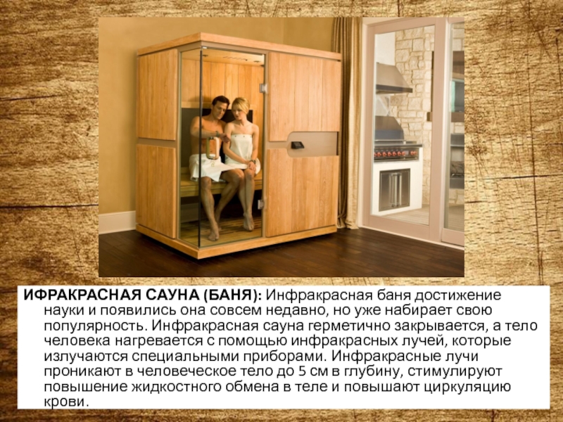 Слайд 21ИФРАКРАСНАЯ САУНА (БАНЯ): Инфракрасная баня достижение науки и появились она совсем недавно,